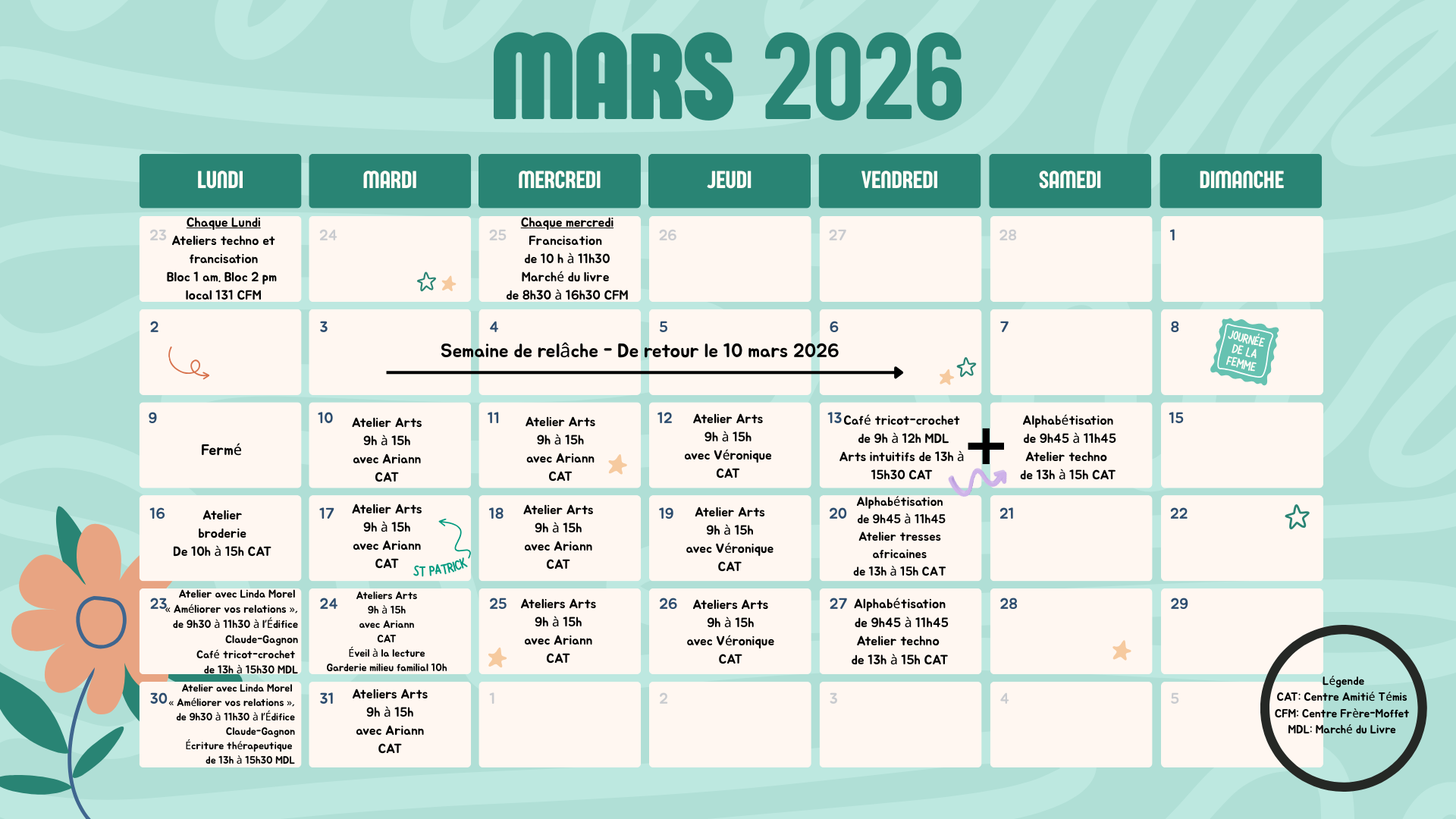 Cet atelier propose un espace d’expression par l’écriture pour déposer ses pensées, explorer ses émotions et prendre un moment pour soi. À travers différentes propositions d’écriture, les participantes et participants sont invités à se reconnecter à leur vécu dans un cadre respectueux, bienveillant et sans jugement. Une approche douce pour favoriser le mieux-être et la réflexion personnelle.